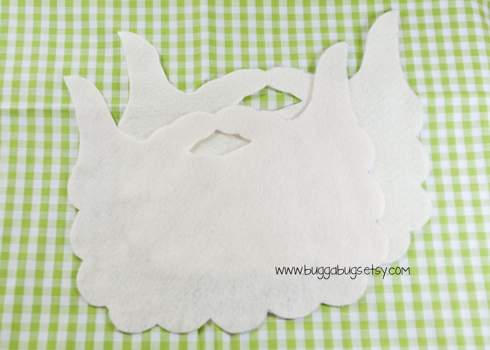 4. Sandwich the elastic ends between the beard pieces at the very top. Sew around the edges of the beard. I like to sew over the elastic a couple of times just to reinforce things. Leave the mouth open for now.